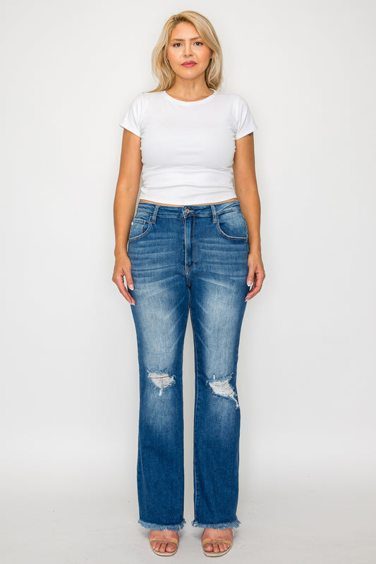 Regular price $109.00 USDRegular priceUnit price / perSale price $109.00 USDThese premium bootcut jeans feature a flattering high-rise fit and fashion distressed details. Made from quality stretch denim in a versatile medium blue wash, they showcase intentional distressing at the knees and fashionable raw hem detailing. The bootcut silhouette creates a balanced proportion while the frayed edges add a contemporary touch. Perfect for casual to semi-casual wear, these jeans combine comfort with style through their premium cotton-blend construction and thoughtful design elements.
